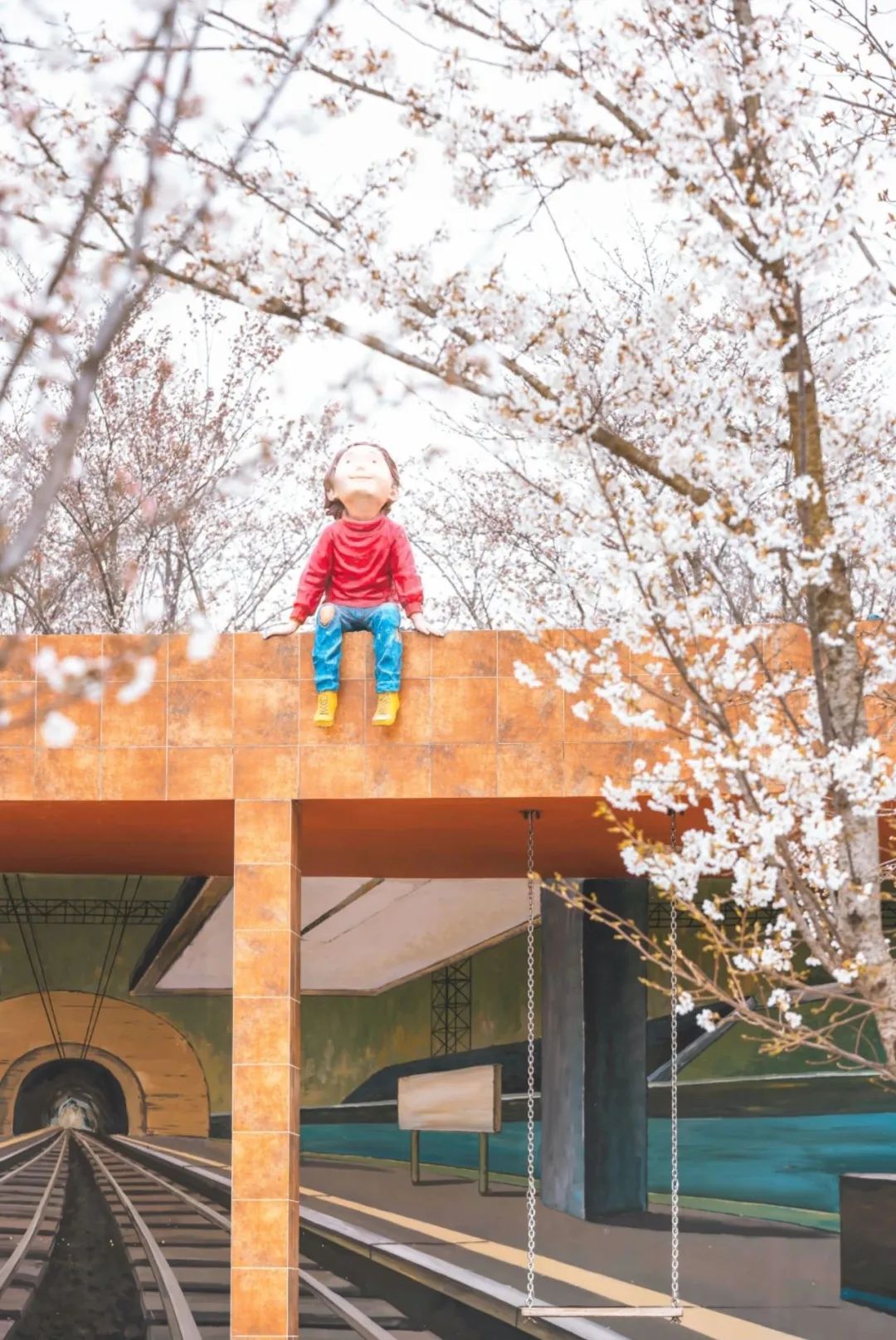 轨道间的樱花树肆意生长,花瓣飘落时,仿佛听见时光列车载着春天轰隆驶来。