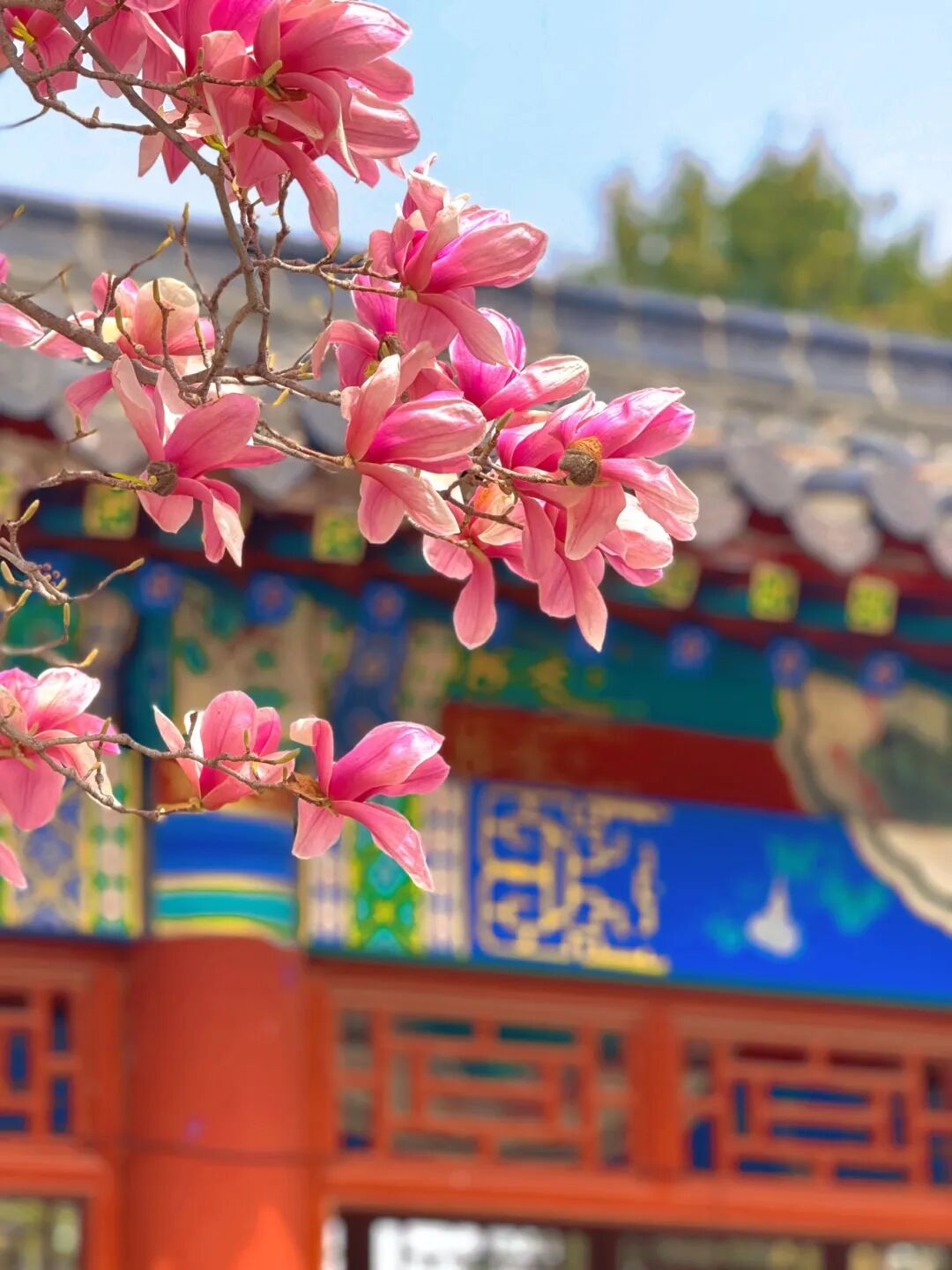 江南园林的骨架下,玉兰、海棠、牡丹等花卉在春风的吹拂下竞相绽放。