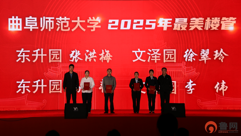 颁奖环节,日照大学科技发展集团党委副书记书记尹相文,山海天物业管理有限责任公司经理许浩为曲阜师范大学2025年“最美宿管”颁奖,文泽园管理处徐翠玲、李伟上台领奖。他们凭借日常工作中细致入微的服务,收获了曲园学子的认可与敬意。