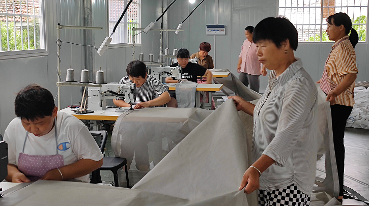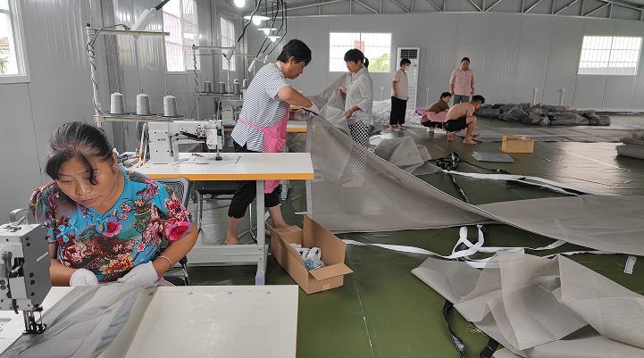 只见车间内十余名工人正在有序作业,通过裁剪、缝制、检验等多道工序,合格的防炎网、防炎布、防音布等成品就生产出来,这些产品将出口日本,广泛用于建筑防火、隔音。