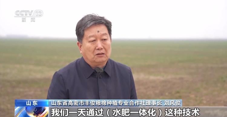 山东省高密市丰俊粮棉种植专业合作社理事长 刘风俊:我们一天通过水肥一体化技术,一个人工能浇200亩地左右,但是我们以前通过人工漫灌,也就浇5亩到6亩地。