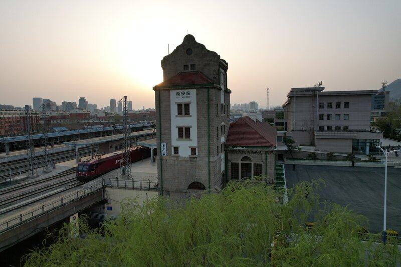 泰山火车站建于清宣统元年(公元1909年),1910年底竣工,最初称为“泰安府车站”,是津浦铁路北段的重要站点。这座德式建筑,全部由青色花岗岩砌成,木质地板结构,主楼6层高约25米,站房为上下两层建筑,钟楼、票房一应俱全,简直就是一座历史的博物馆。历经百年沧桑,老站房见证了泰安城市发展和中国铁路交通的变迁,具有极高的历史价值和文化意义。