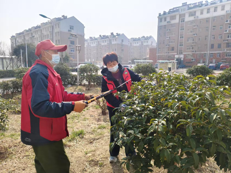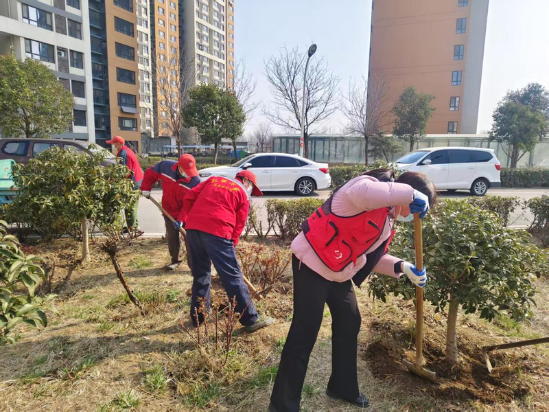 理论学习后,大家分组进入社区绿地,对桂花树、花灌木及绿化带进行集中养护,有的手持修枝剪修剪徒长枝,有的挥动锄头松土除草,有的为绿植浇灌定根水,一派热火朝天的劳动景象。