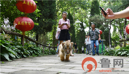 7月10日,记者在潍坊金宝乐园动物园区见到了这只正在跟着饲养员“散步”的小老虎,肉嘟嘟的小爪子慢悠悠的走着,样子憨态可掬,与印象中老虎凶猛的样子完全不同。“桃子”不管走到哪里,身后都跟随者一群“铁粉”拍照合影。
