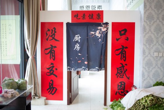 在安丘慧日公益免费大食堂的主店的厨房门口,贴着一副对联,上联是“没有交易”,下联是“只有感恩”,这正是李鹏程对于公益的初心。