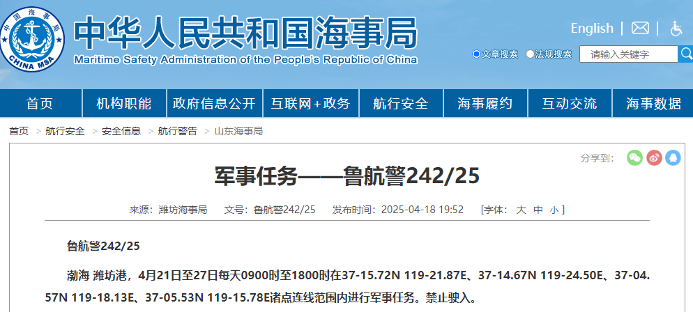 近日,潍坊海事局发布航行警告:4月21日至27日每天9时至18时,渤海潍坊港部分区域进行军事任务,禁止驶入。