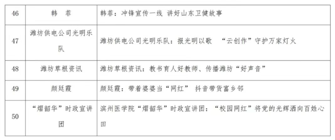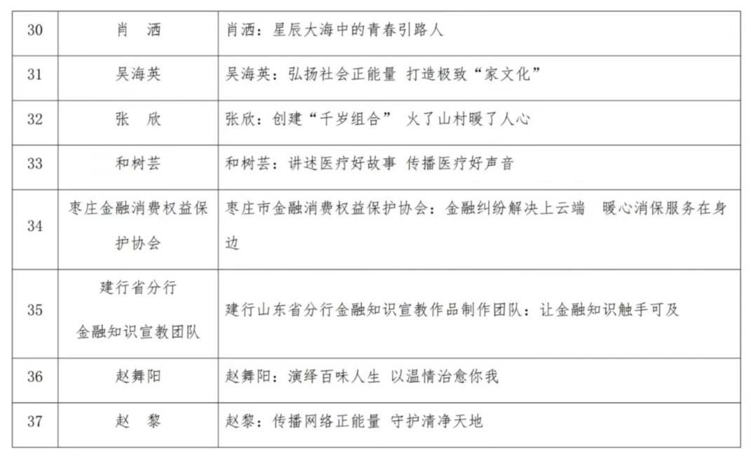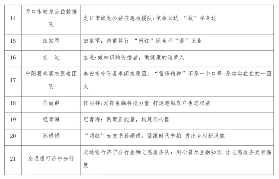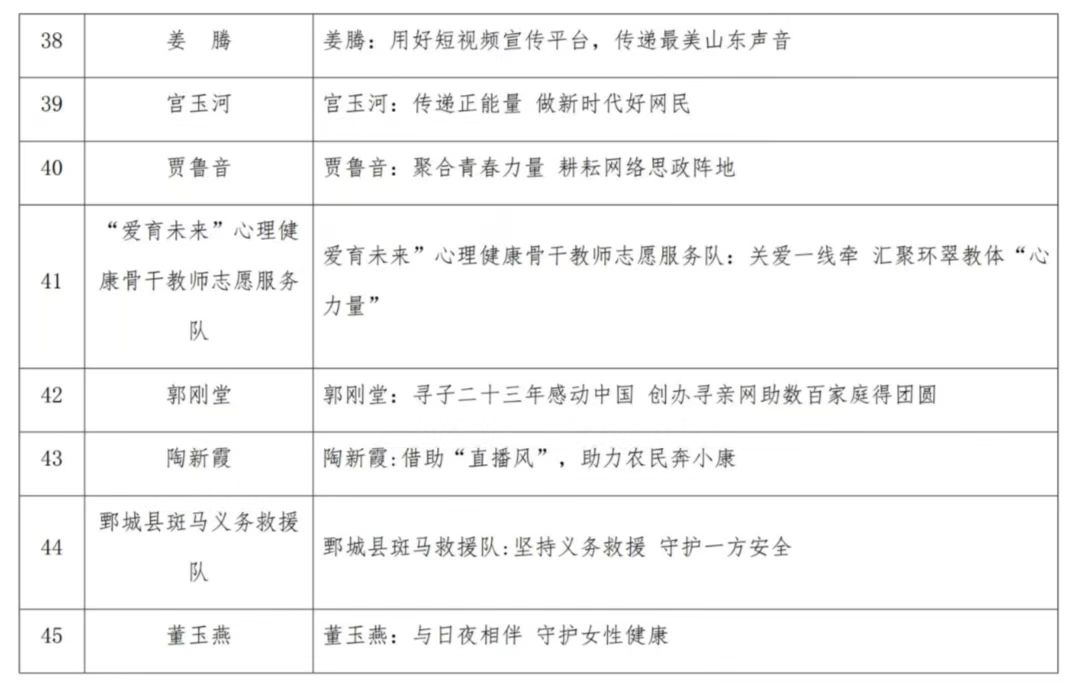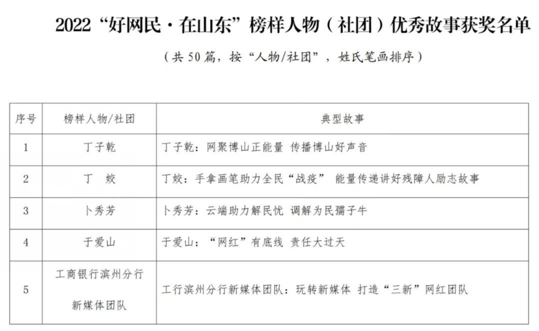 今年4月份,由省委网信办,省总工会、共青团山东省委、省妇联、省教育厅、省卫生健康委、中国人民银行济南分行联合举办“好网民·在山东”榜样人物(社团)优秀故事评选,综合考虑社会影响力、传播力、创新性、覆盖面等因素,经认真评审,共评出50个优秀故事。