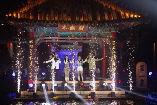 敬泉盛典现场布置围绕趵突泉泉池进行搭建,在原有景观的基础上增加表演区域,打造沉浸式体验舞台。观澜亭两侧设置大型立体荷花、荷叶造型,夜幕中的趵突泉灯光璀璨,流光溢彩。