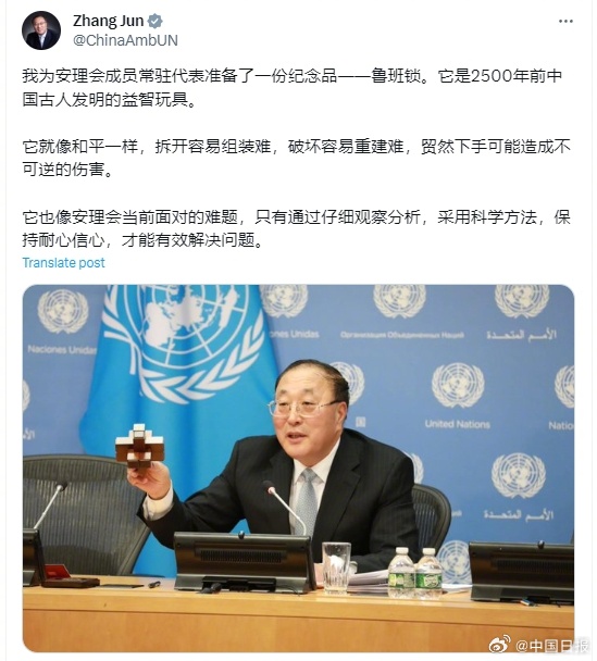 “鲁班锁就像和平一样,拆开容易组装难,破坏容易重建难,贸然下手可能造成不可逆的伤害。它也像安理会当前面对的难题,只有通过仔细观察分析,采用科学方法,保持耐心信心,才能有效解决问题。”张军说,“中方期待安理会成员、广大会员国像鲁班锁的各个部件那样,紧密团结在一起,共同推动安理会工作取得积极成效。”