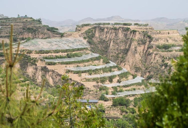 在陕西省榆林市米脂县高西沟水土保持示范园,当地利用梁峁坡地上修建的水平梯田种植果树。(□新华社记者 李贺 报道)