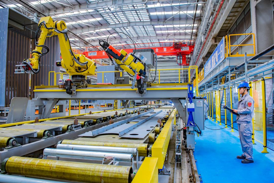 走进新能船业联合车间,无人运输车有序穿梭,将切割产线的各式钢材零部件送往焊接产线。车间7条生产线,原本需要400余名员工紧密协作,智能化升级后仅需100多人就能高效运转,年可加工钢材10.8万吨。