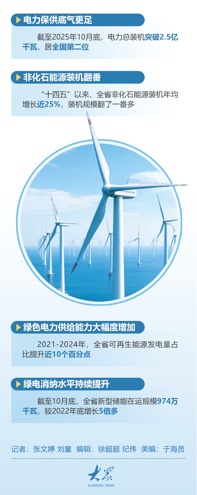 “十四五”以来,山东坚决端牢能源饭碗,统筹能源供应保障、绿色转型和改革创新,加快建设能源绿色低碳转型示范区,全省能源高质量发展取得突破性进展。截至2025年10月底,电力总装机突破2.5亿千瓦,居全国第二位,省内机组发电量将达到7000亿千瓦时左右。一体推进核、风、光、地热等清洁能源多元发展,全省每3度用电中就有1度是清洁能源。用好改革关键招,率先建立独立储能参与电力现货市场交易机制;制定重点能源项目管理办法,近几年能源领域项目每年投资均超过2000亿元。