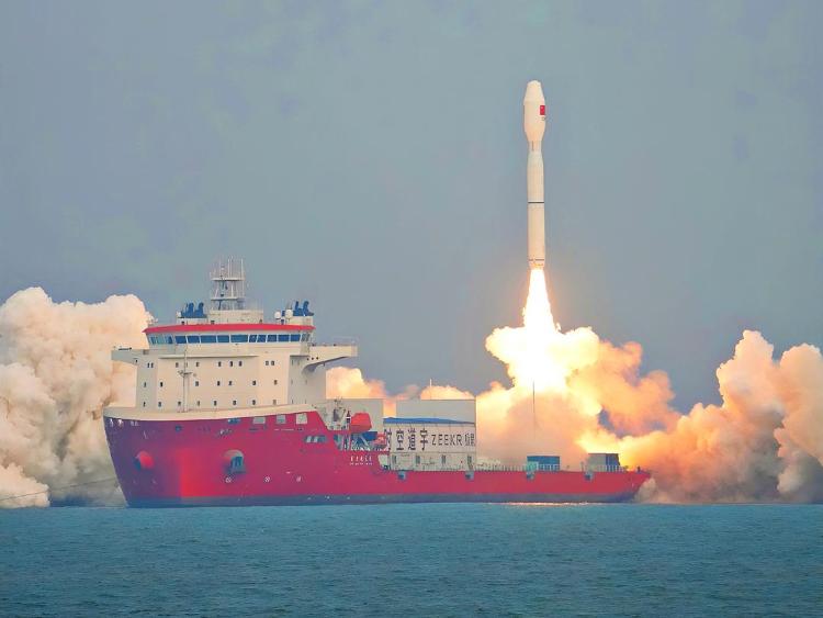 2025年9月24日,捷龙三号遥八运载火箭搭乘“东方航天港”号发射船,在山东近海海域点火升空。资料图
