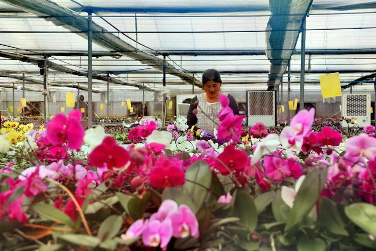 大棚里,粉白、玫红的蝴蝶兰亭亭玉立,工人们分工有序——有的给幼苗换盆,有的为盛开的花枝塑形。来自窦楼村的张艳玲正打理着一株“满天红”蝴蝶兰,她笑着说:“中午管饭,一个月3000多块,在家门口就能挣钱,还能照顾老人孩子。”