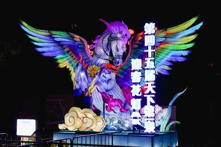 《南门贺岁·悦马泉城》展区以瑞马为核心,融泉城灵秀与民俗雅意于光影之间,将传统闹春元素、生肖贺岁、泉水茶韵、齐鲁曲艺巧妙交融,在千年泉水潺潺流淌间,开启一场凝聚民俗暖意与泉城风华的新春灯宴。