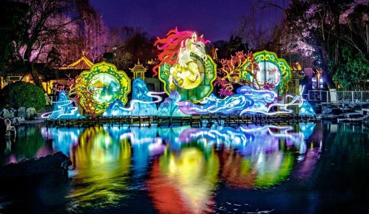为保障赏灯体验,灯会期间,园区暂停《趵突夜画》夜游项目,但夜游的水下灯光系统配合灯会同步开启,以极致的光影布置打造沉浸式赏灯场景。