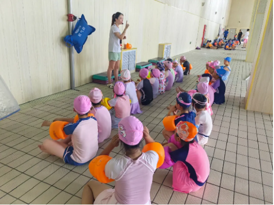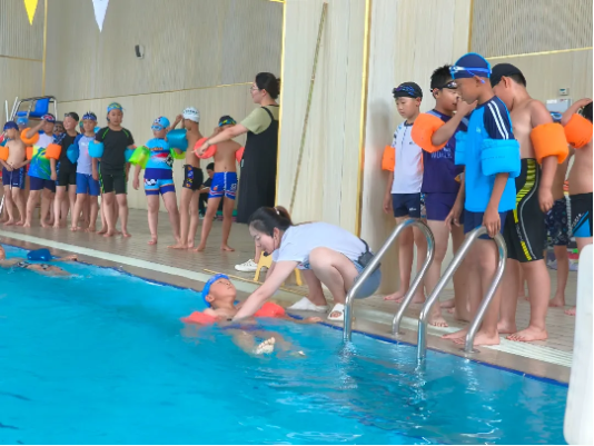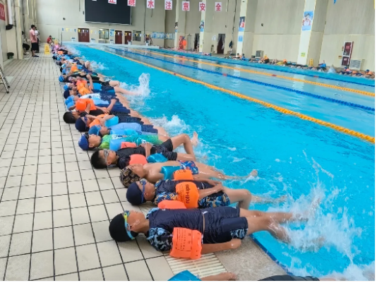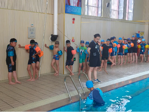 课堂上,游泳馆内的教练们先带领同学们在泳池边做热身运动。教练员们悉心教学、认真辅导,及时发现并解决问题,积极鼓励学生敢于挑战,勇于突破自己,帮助学生逐渐战胜畏水心理,从而更好地投入到游泳学习中去。